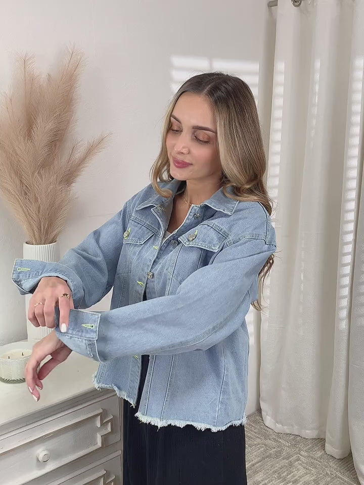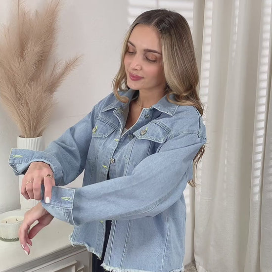 Effortlessly stylish and endlessly versatile, this Light Wash Dropped Shoulder Raw Hem Denim Jacket adds the perfect laid-back edge to any outfit. Designed with a relaxed fit and a slightly cropped silhouette, it features dropped shoulders and a raw-cut hem for a modern, undone look. Crafted from soft yet durable denim, this jacket transitions seamlessly from season to season — ideal for layering over dresses, tees, or cozy sweaters. A timeless wardrobe essential with a contemporary twist.